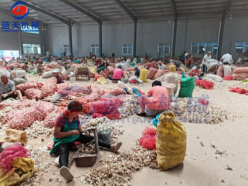 工人們先把蒜蒂去除,去除的大蒜通過(guò)傳送帶送往機(jī)器中剝皮,分瓣、切片